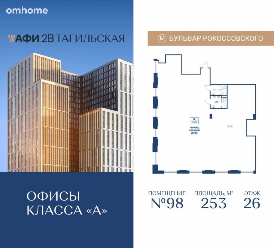 Продается коммерческое помещение общей площадью 253 м2 на 26 этаже в строящемся бизнес-центре АФИ2В Тагильская. 26-этажный бизнес-центр АФИ2В Тагильская от девелопера с мировым именем AFI Development – это инновационный комплекс, задающий новый стандарт деловых пространств на востоке Москвы. Проект объединяет статусные офисы, ресторанный дворик, супермаркет и озеленённую террасу, создавая полноценную экосистему для бизнеса. На первых этажах...