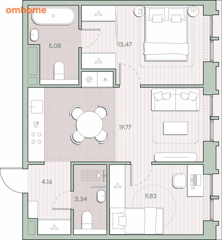 Жилая площадь 23.3 м2, кухня 19.77 м2, квартира без отделки, комнаты изолированные.