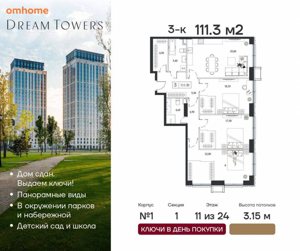 Продажа 3-комнатной квартиры 111,3 м²