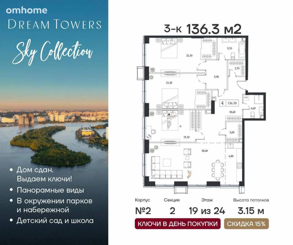 Продажа 3-комнатной квартиры 136,3 м²
