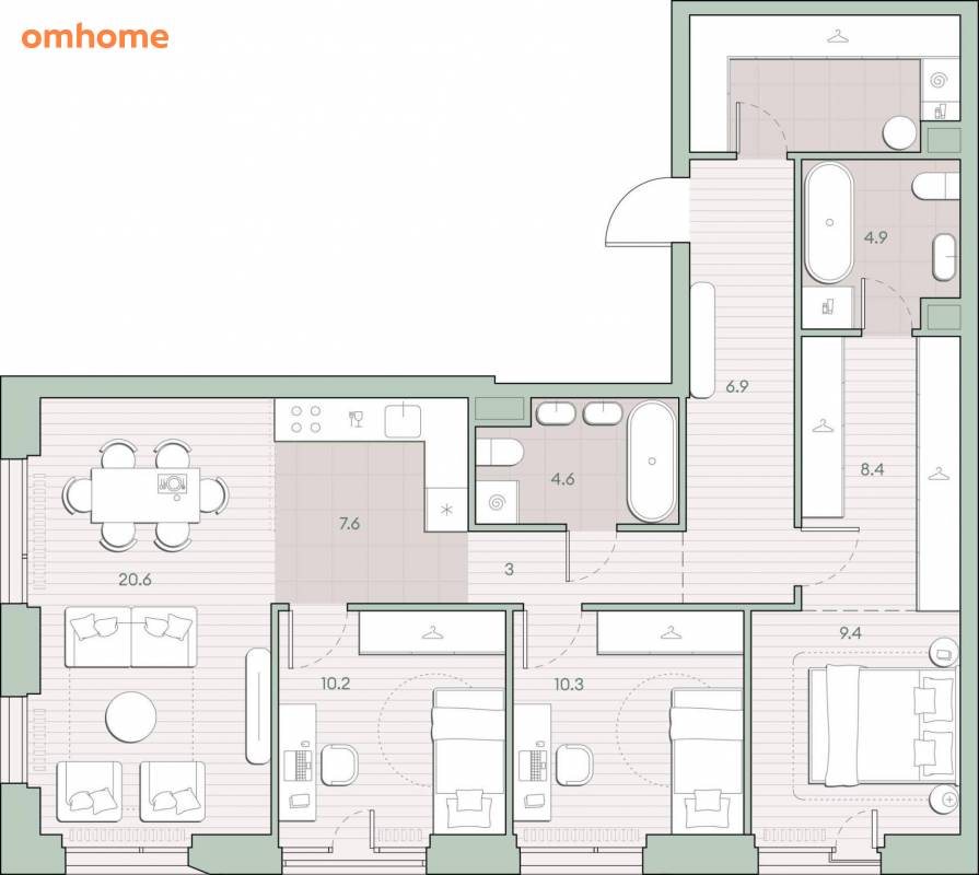 Жилая площадь 50.5 м2, кухня 7.6 м2, предчистовая отделка, комнаты изолированные.