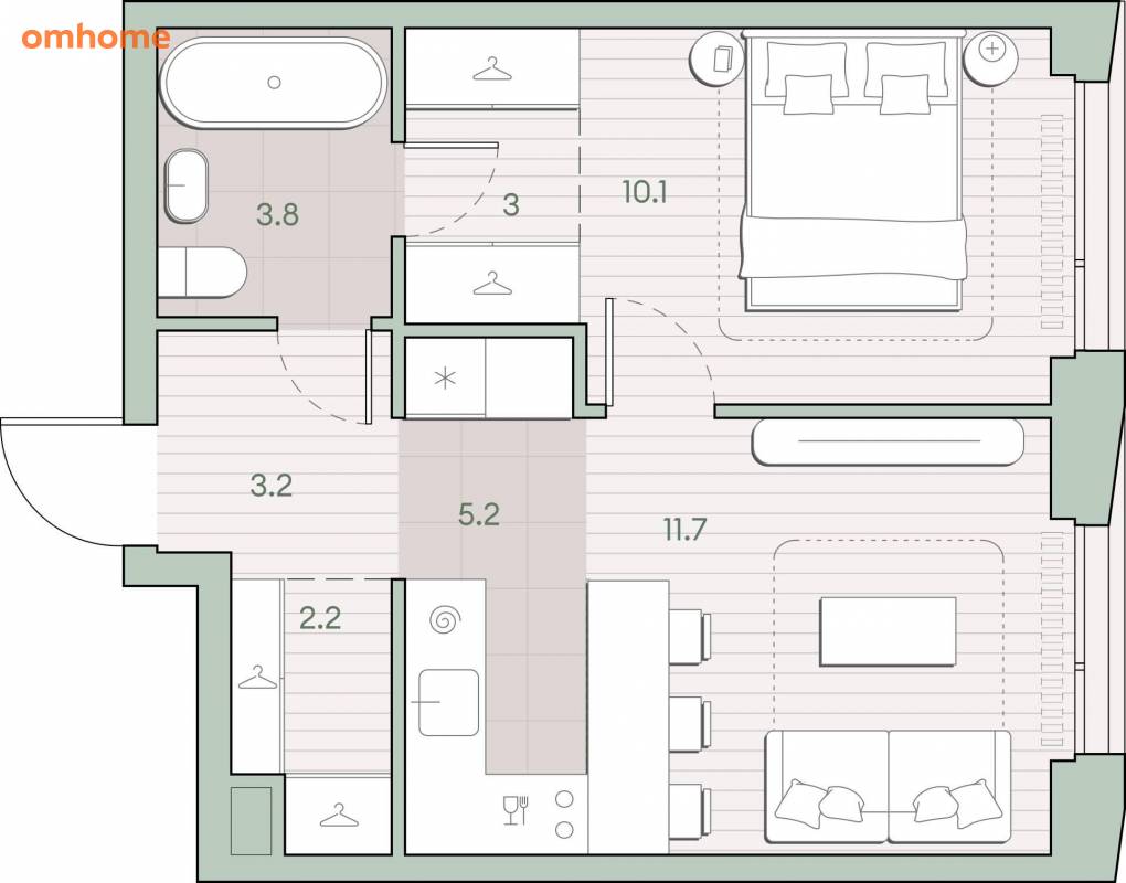Жилая площадь 21.8 м2, кухня 5.2 м2, предчистовая отделка, комнаты изолированные.