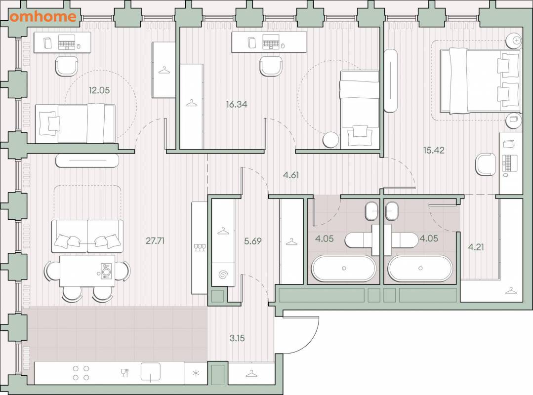 Жилая площадь 43.81 м2, кухня 27.71 м2, предчистовая отделка, комнаты изолированные.