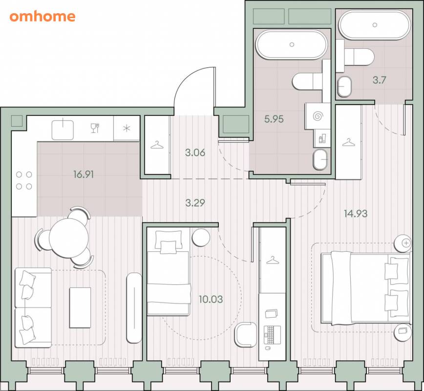 Жилая площадь 24.96 м2, кухня 16.91 м2, предчистовая отделка, комнаты изолированные.