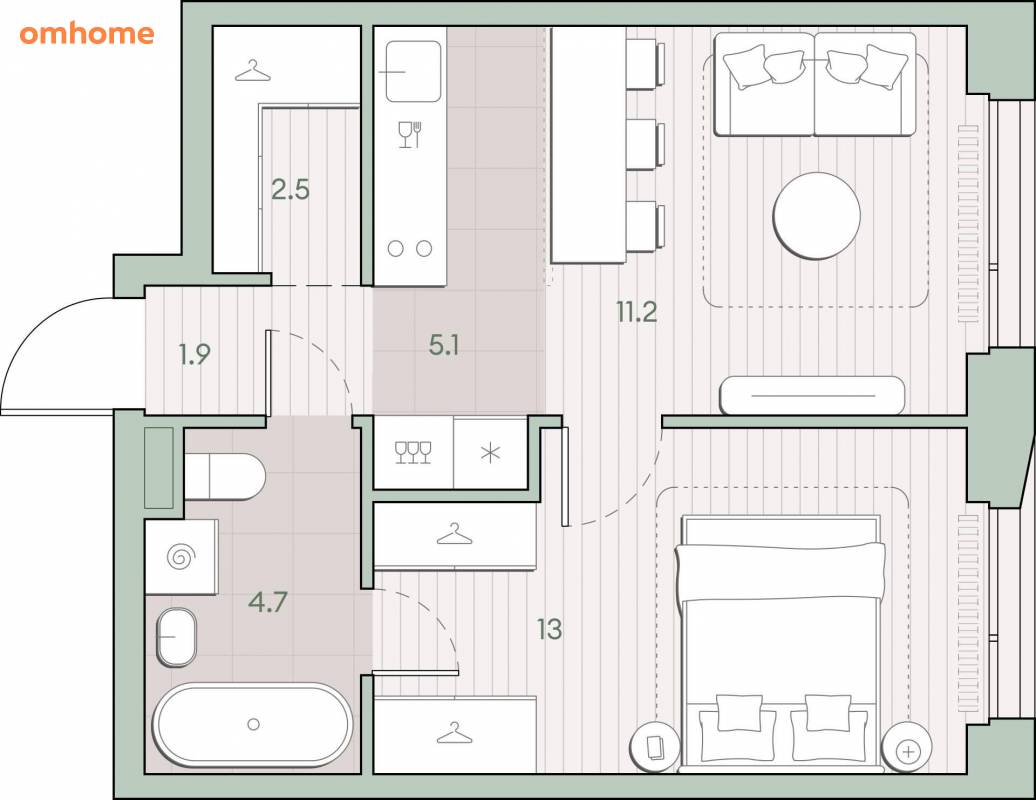 Жилая площадь 24.2 м2, кухня 5.1 м2, квартира без отделки, комнаты изолированные.