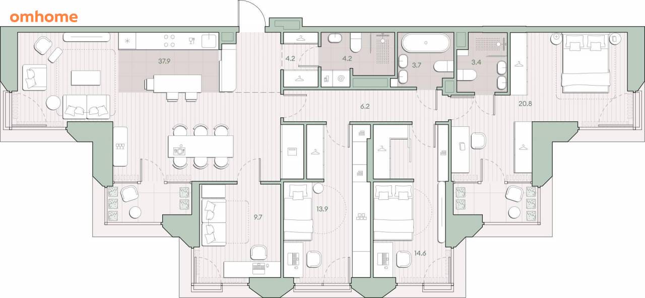 Жилая площадь 59 м2, кухня 37.9 м2, предчистовая отделка, комнаты изолированные.