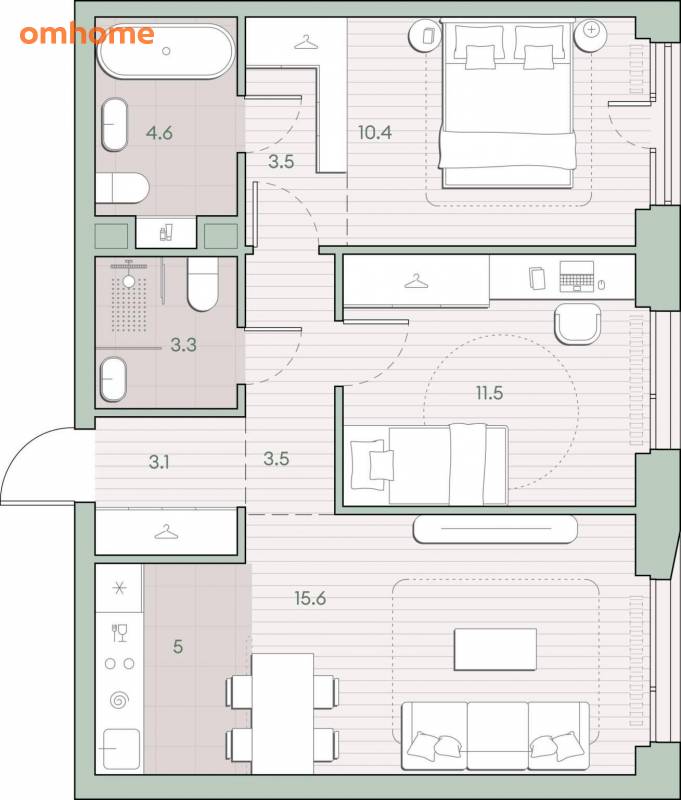 Жилая площадь 37.5 м2, кухня 5 м2, предчистовая отделка, комнаты изолированные.