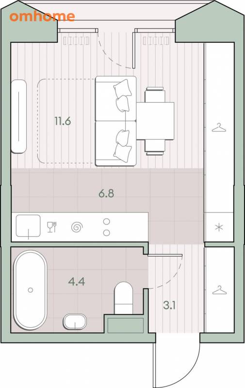 Жилая площадь 11.6 м2, кухня 6.8 м2, квартира без отделки, комнаты изолированные.