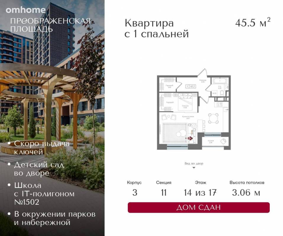 Высота потолков 3,06 м•Вид на улицу