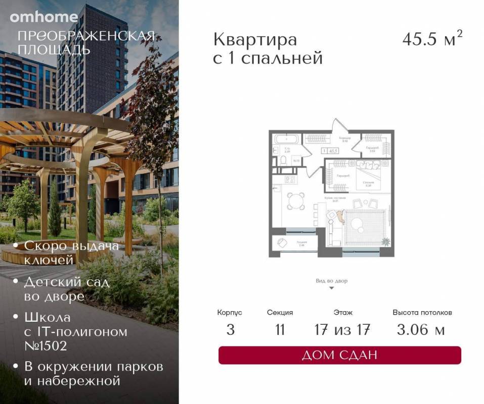 Квартира на 17 этаже в жилом комплексе премиум-класса «Преображенская площадь». Общая площадь: 45.5 кв.м. Проект премиум-класса в историческом районе Москвы. До метро «Преображенская площадь» 3 минуты пешком. Квартиры сдаются без отделки и в свободной планировке, чтобы жители могли оформить пространство с учетом своей индивидуальности. Высота потолков от 3,15м, широкоформатное остекление, 3-5 квартир на этаже. Система Умный дом. Дизайнерские лобби.