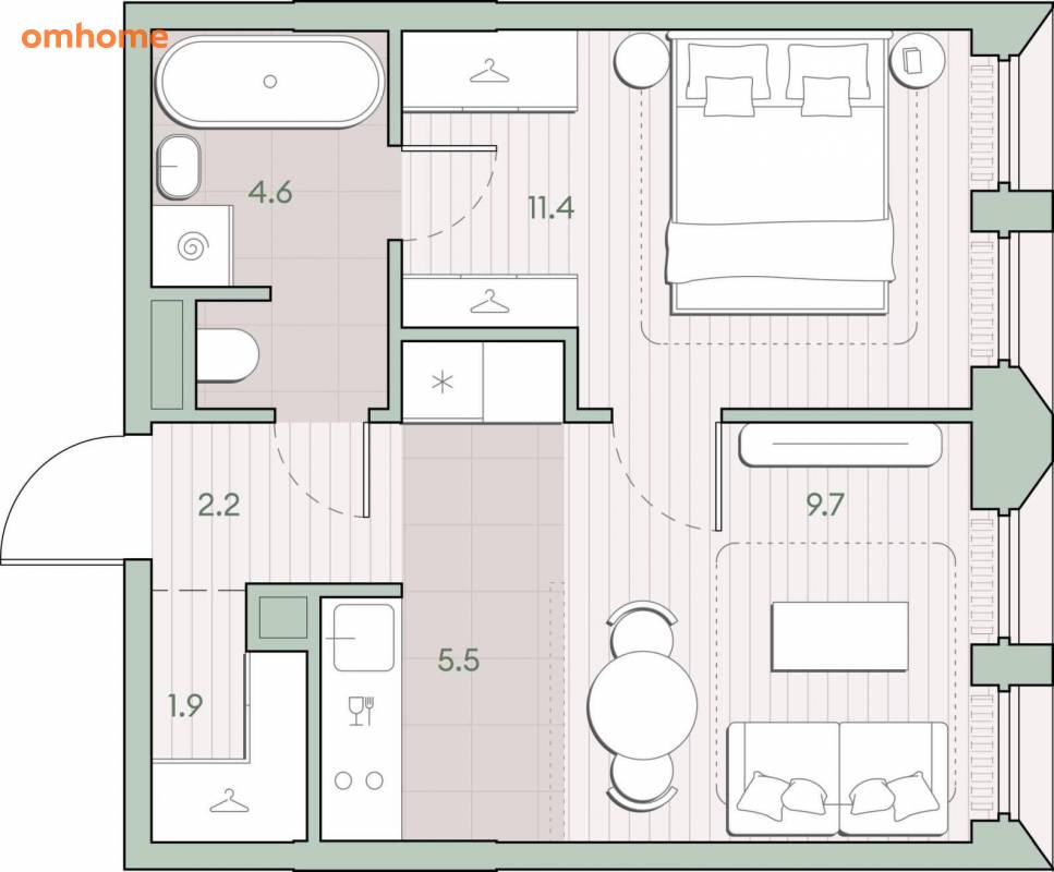Жилая площадь 21.1 м2, предчистовая отделка, комнаты изолированные.