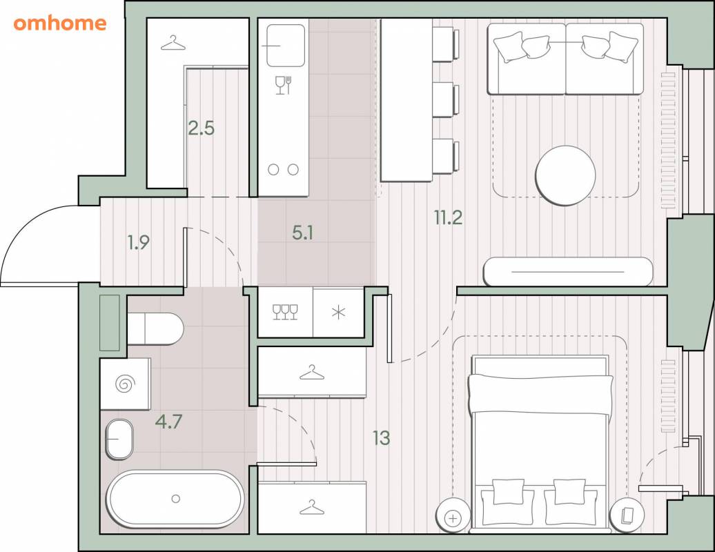 Жилая площадь 24.2 м2, кухня 5.1 м2, квартира без отделки, комнаты изолированные.