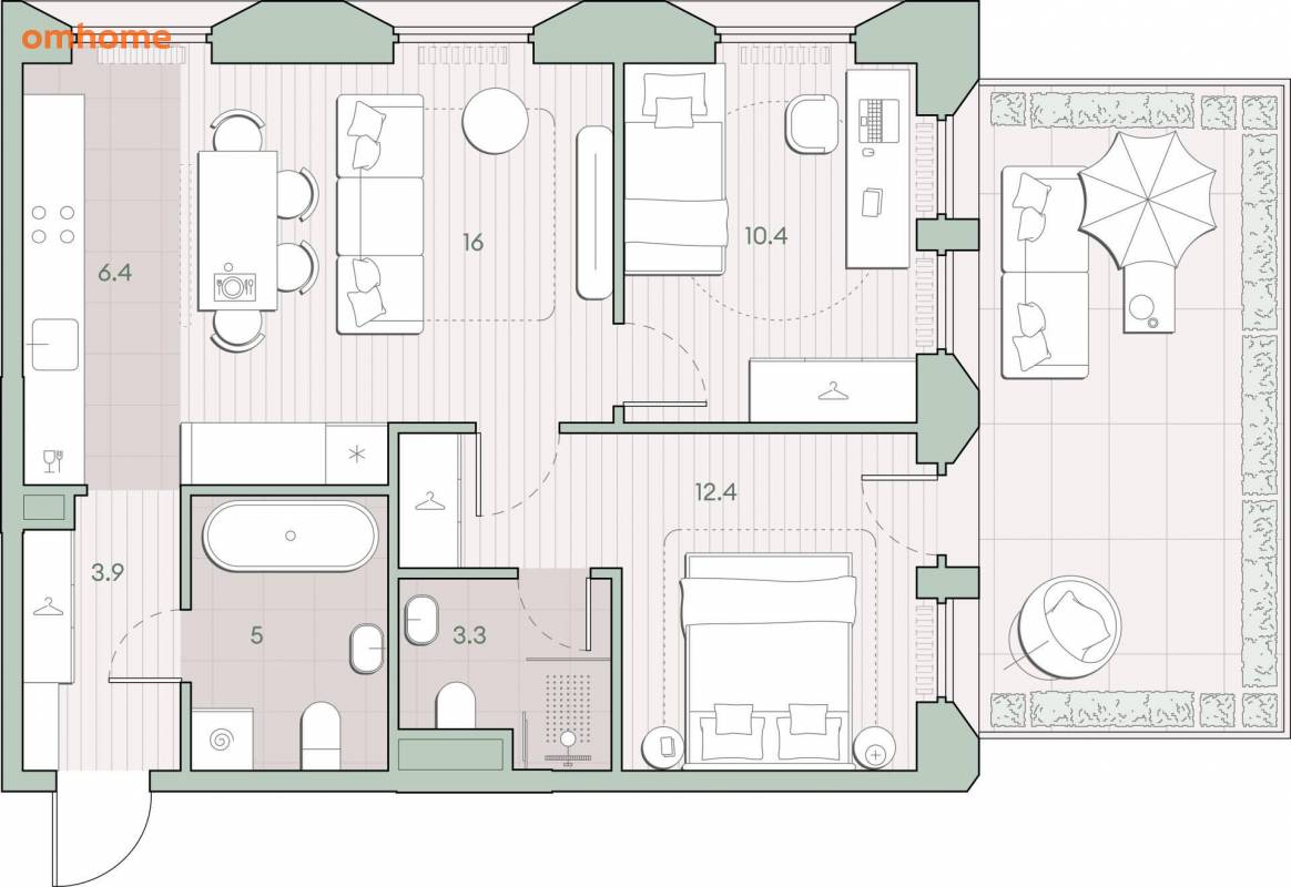 Жилая площадь 38.8 м2, кухня 6.4 м2, предчистовая отделка, комнаты изолированные.