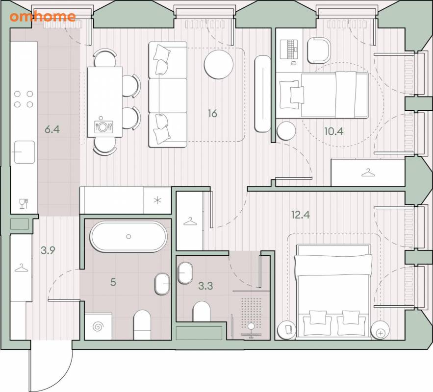 Жилая площадь 38.8 м2, кухня 6.4 м2, предчистовая отделка, комнаты изолированные.