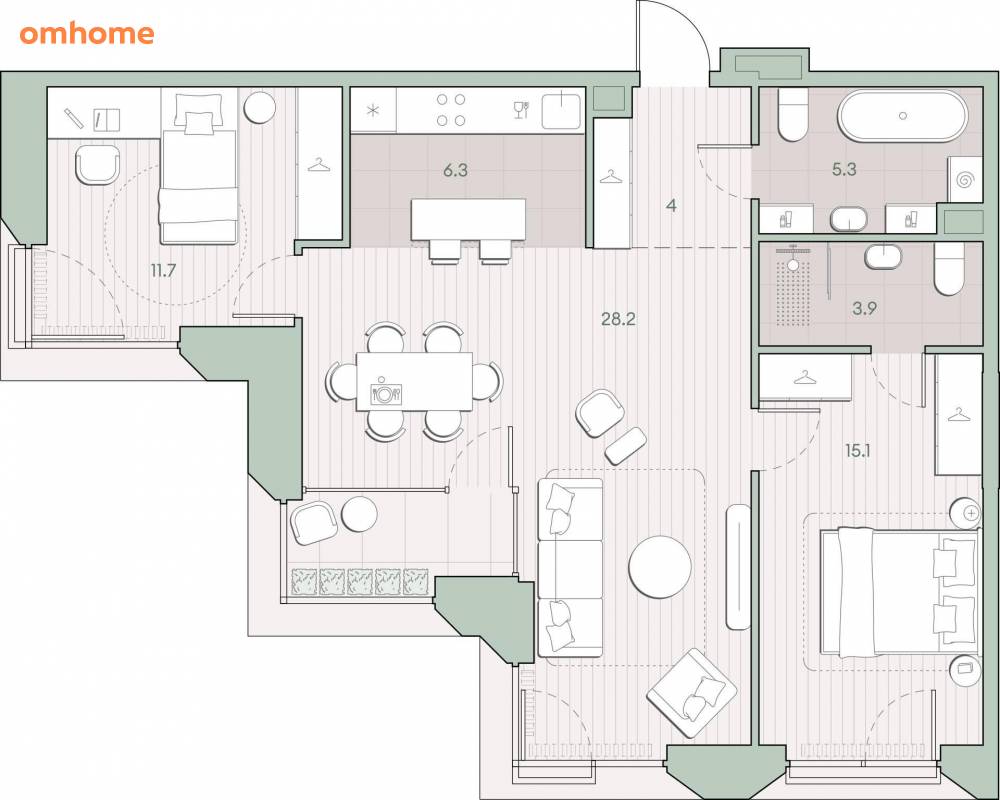 Жилая площадь 55 м2, кухня 6.3 м2, предчистовая отделка, комнаты изолированные.