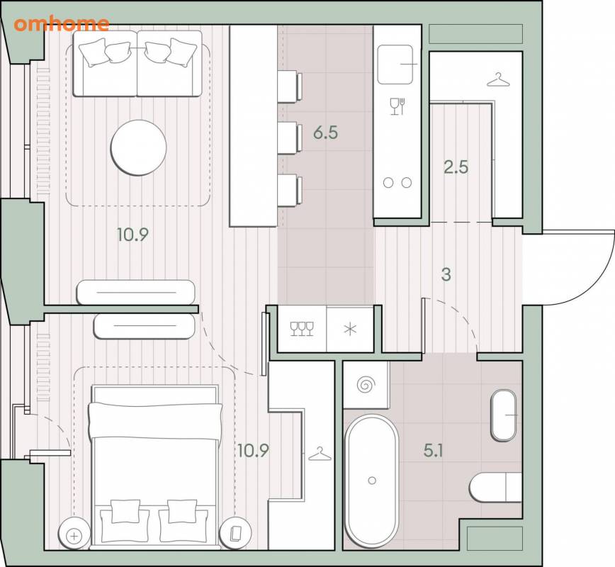 Жилая площадь 21.8 м2, кухня 6.5 м2, квартира без отделки, комнаты изолированные.