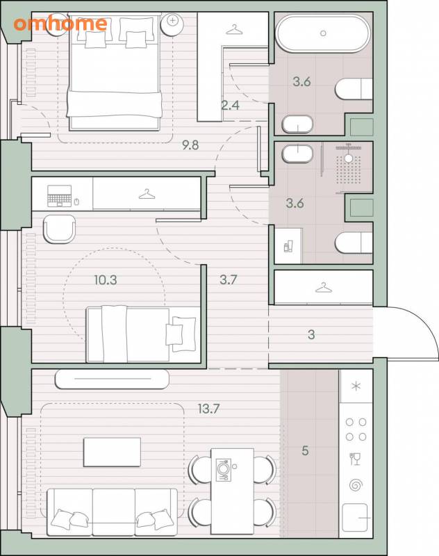 Жилая площадь 33.8 м2, кухня 5 м2, предчистовая отделка, комнаты изолированные.