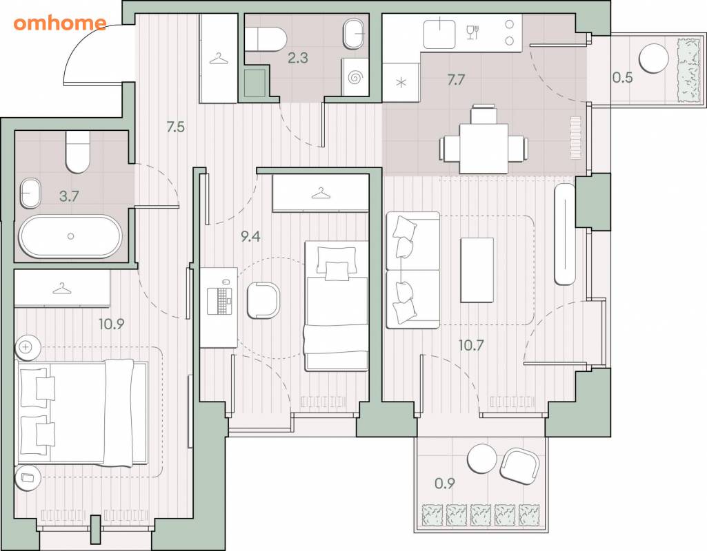 Жилая площадь 31 м2, кухня 7.7 м2, предчистовая отделка, комнаты изолированные.
