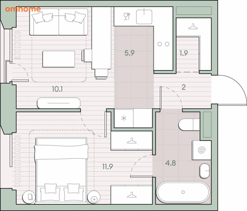 Жилая площадь 22 м2, кухня 5.9 м2, предчистовая отделка, комнаты изолированные.
