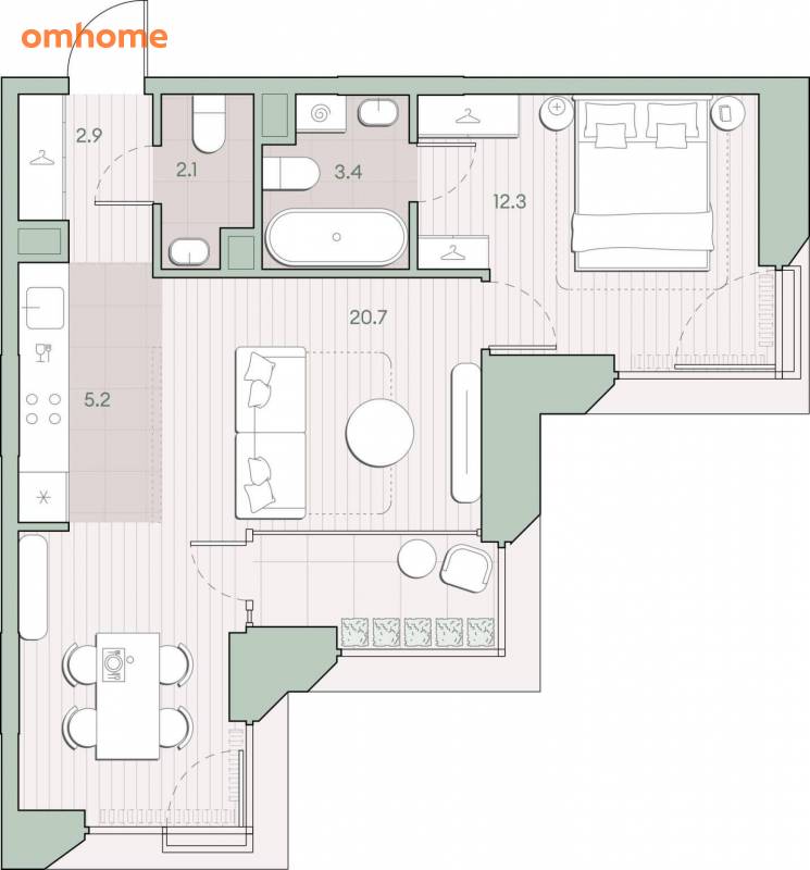 Жилая площадь 33 м2, кухня 5.2 м2, предчистовая отделка, комнаты изолированные.
