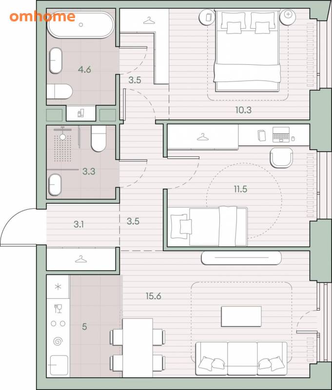 Жилая площадь 37.4 м2, кухня 5 м2, предчистовая отделка, комнаты изолированные.