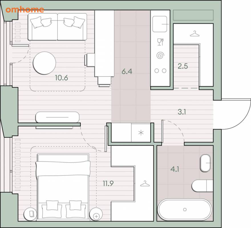 Жилая площадь 22.5 м2, кухня 6.4 м2, предчистовая отделка, комнаты изолированные.