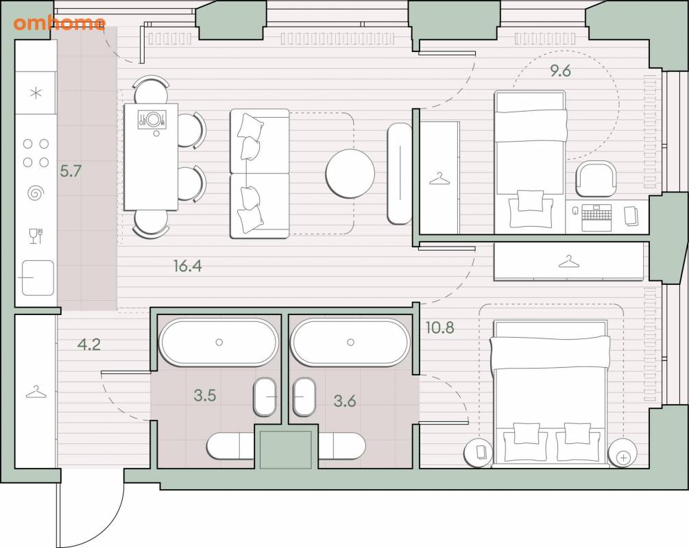 Жилая площадь 36.8 м2, кухня 5.7 м2, предчистовая отделка, комнаты изолированные.