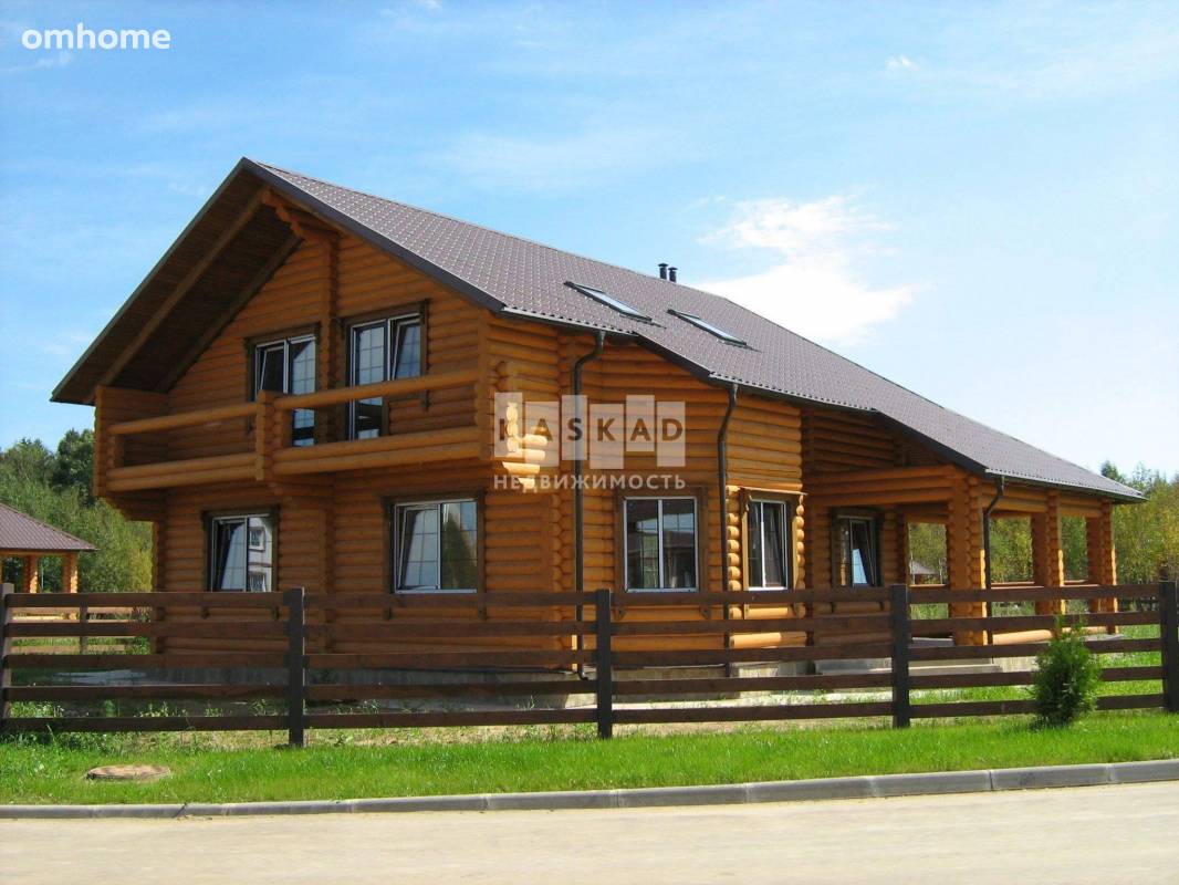 Экологичный дом из бревна с балконом и террасой в центре поселка у живописного фонтана. В благоустроенном, охраняемом коттеджном поселке «Троица», спланированном в едином архитектурном стиле. Новая Рига!