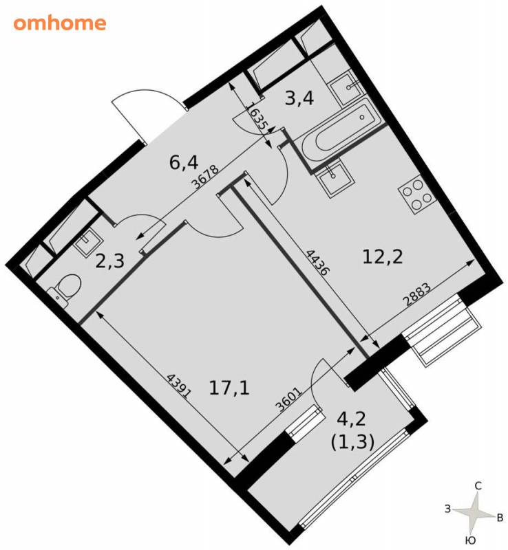 Продажа 1-комнатной квартиры 42,7 м²